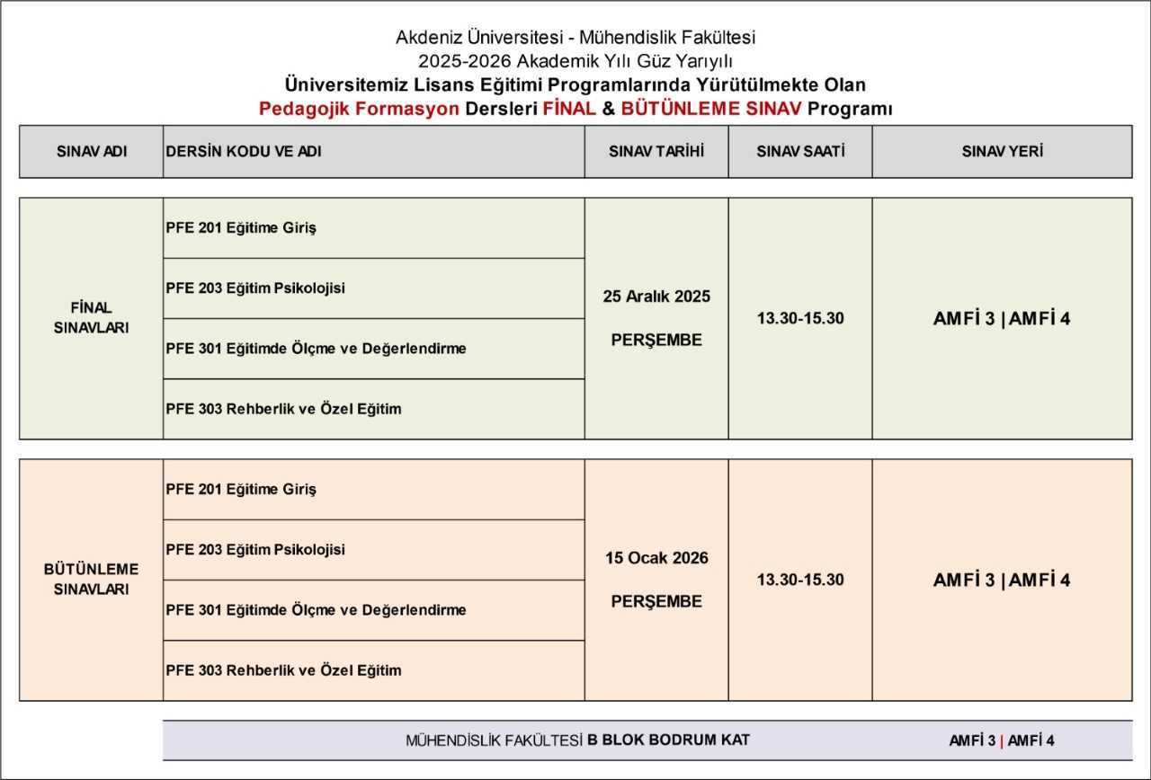 2025-2026 Güz Yarıyılı Pedagojik Formasyon Dersleri Bütünleme Sınav Programı